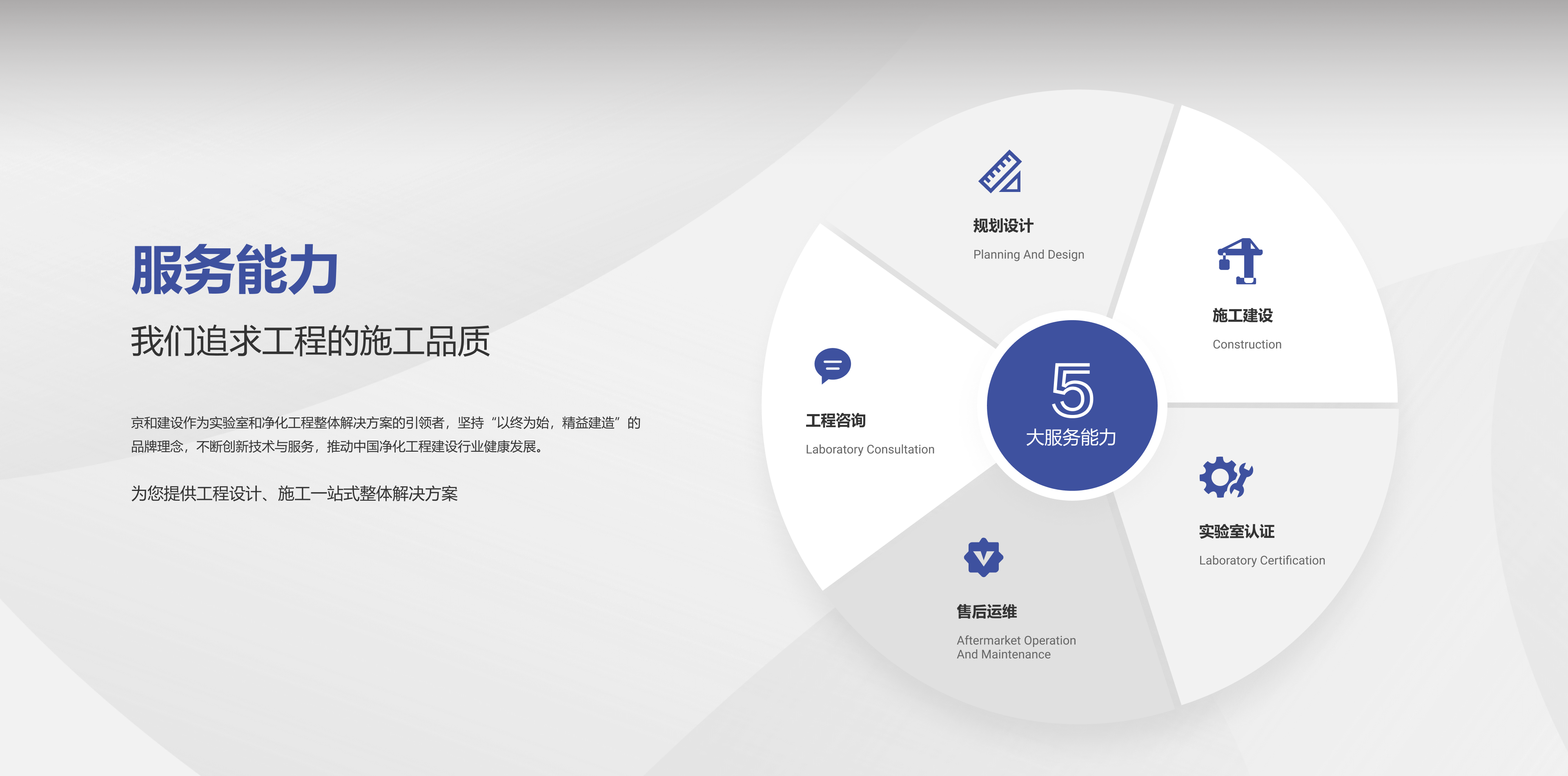 蘇州京和建設科技有限公司(簡稱“京和建設”),成立于 2018 年,位于蘇州市吳中區商圈 CBD核心位置,服務內容涵蓋工程咨詢、規劃設計、施工建設、實驗室認證和售后運維等,是一家專注服務于電子半導體、生物醫藥、化工環保、新能源等高科技領域的總包工程公司,是國內領先的高科技產業工程綜合服務商。服務客戶 300+,業務遍及長三角城市群。
